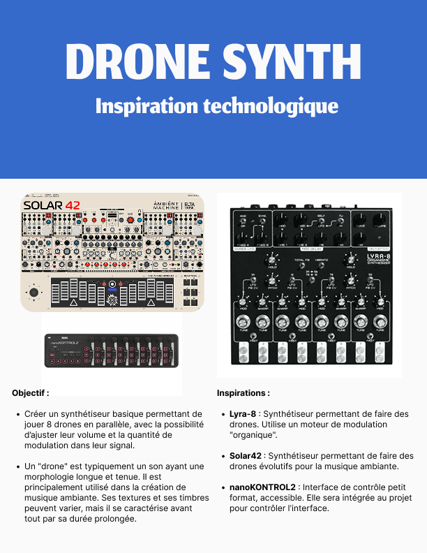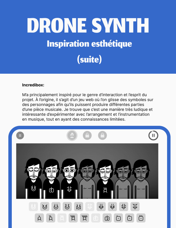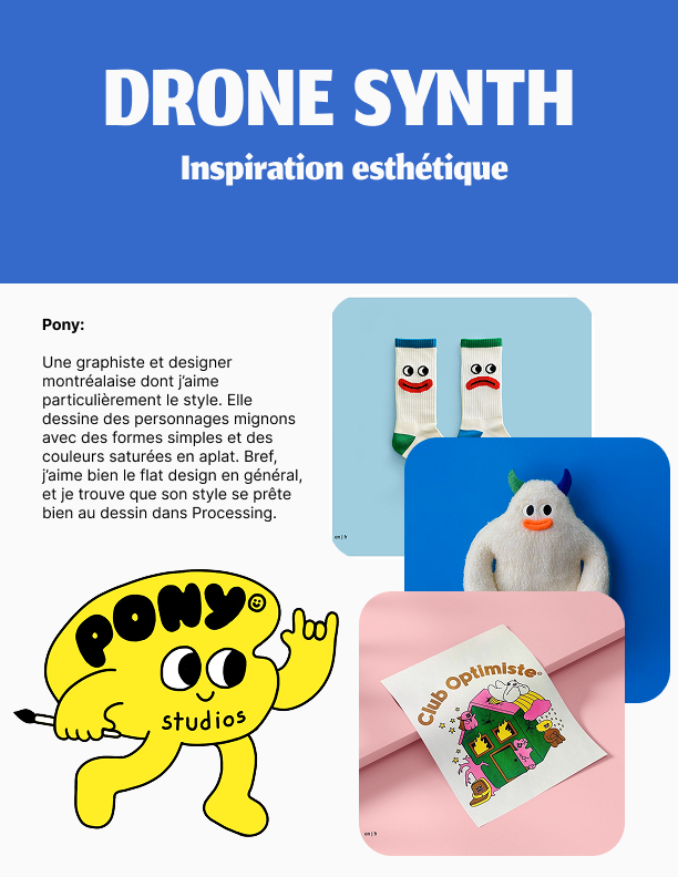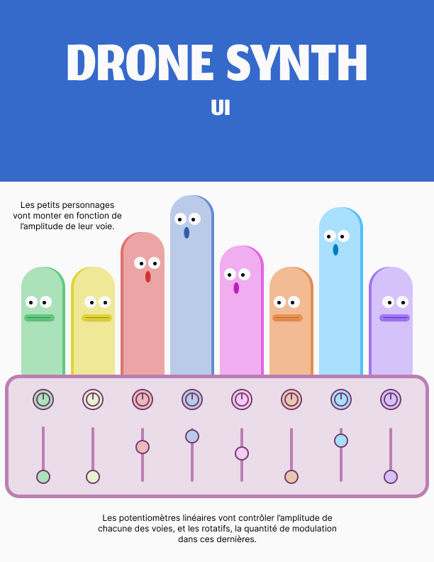 Voici mon projet de fin de session pour mon cours de programmation avec Processing. J’ai conçu et programmé un synthétiseur produisant des drones, représentés par de petits personnages qui bougent au rythme des oscillateurs, lesquels peuvent être manipulés grâce à une interface graphique. L’utilisateur peut aussi changer le type de forme d’onde des oscillateurs en appuyant sur les boutons situés en haut à gauche.