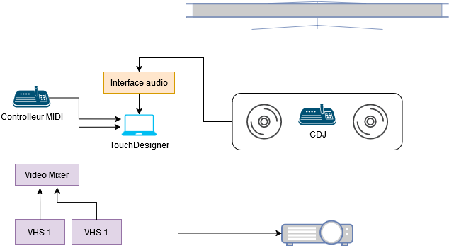 Un set de VJ réalisé avec deux lecteurs VHS et dans un mixeur vidéo DIY comme source. Le signal était ensuite transmis dans TouchDesigner pour y appliquer des effets et les contrôler de manière dynamique à l'aide d'un contrôleur MIDI et de l'audio du mixeur DJ.